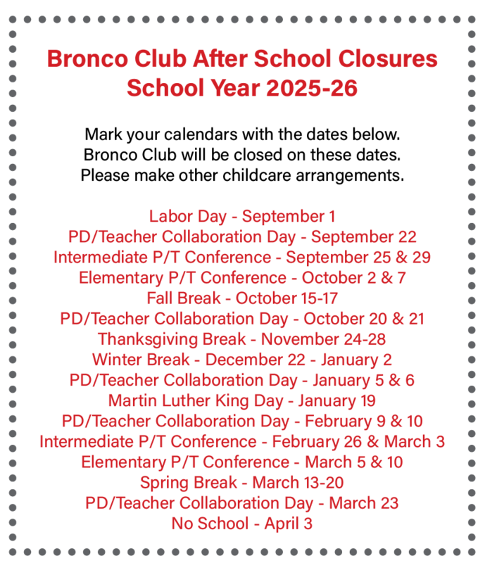 Registration Fee: There is a non-refundable enrollment fee of $25 per child is due at the time of enrollment and will be electronically processed when the contract is approved. Bronco Club enrollment is approved as space and staff allows.