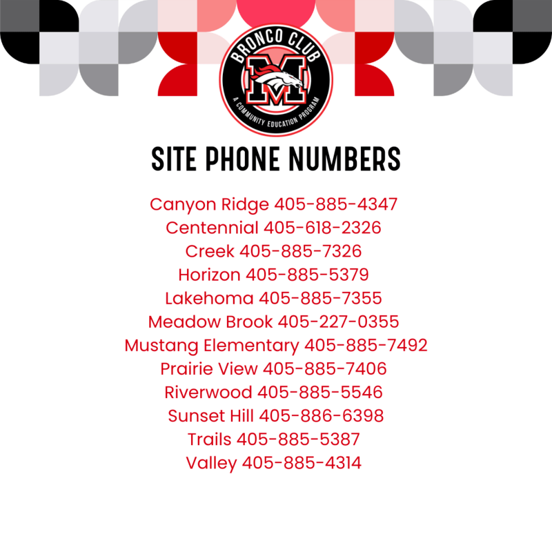5. Absences: It is the responsibility of the parent or guardian to notify the District Bronco Club office if your child will be absent on their scheduled day. Please contact us either by email at broncoclub@mustangps.org or by phone at 405-376-7838 or 405-376-7843.